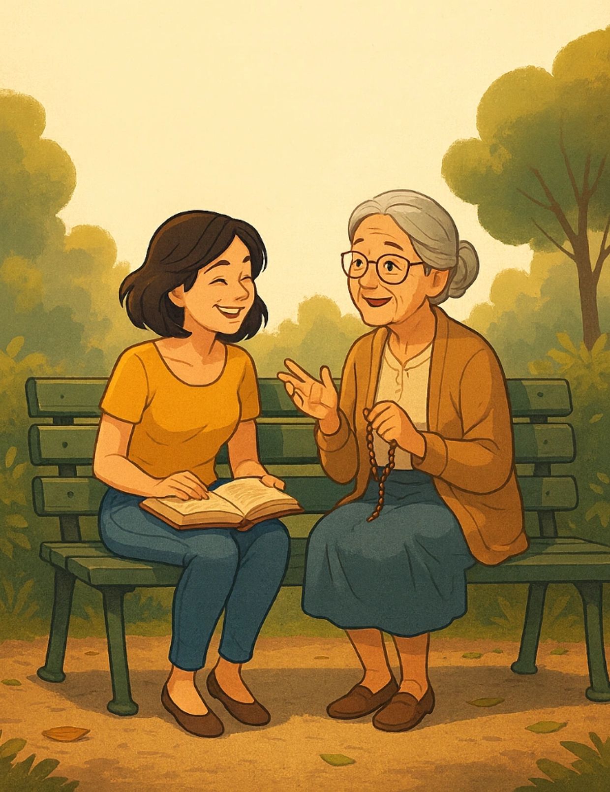 Pasado un rato, mientras leía, se sentó en el banco una señora mayor, con un rosario entre las manos. Le dije: